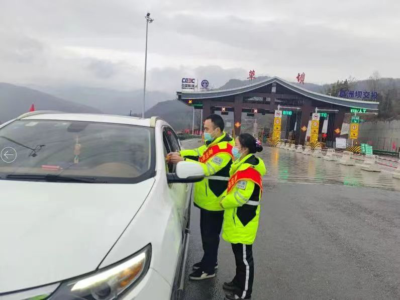 巴萬高速團支部兩位團員在雨中為過路司乘分發《通行指南》,協助解決道路事故等突發情況,為保通保暢貢獻青春力量。