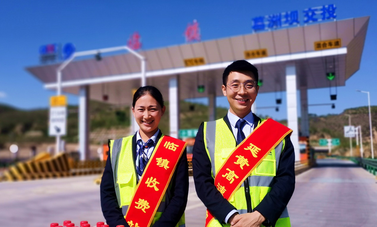延黃高速臨鎮收費站兩位收費人員帶著綬帶,在炎熱天氣下熱情地為過往司乘送上礦泉水,緩解暑氣。